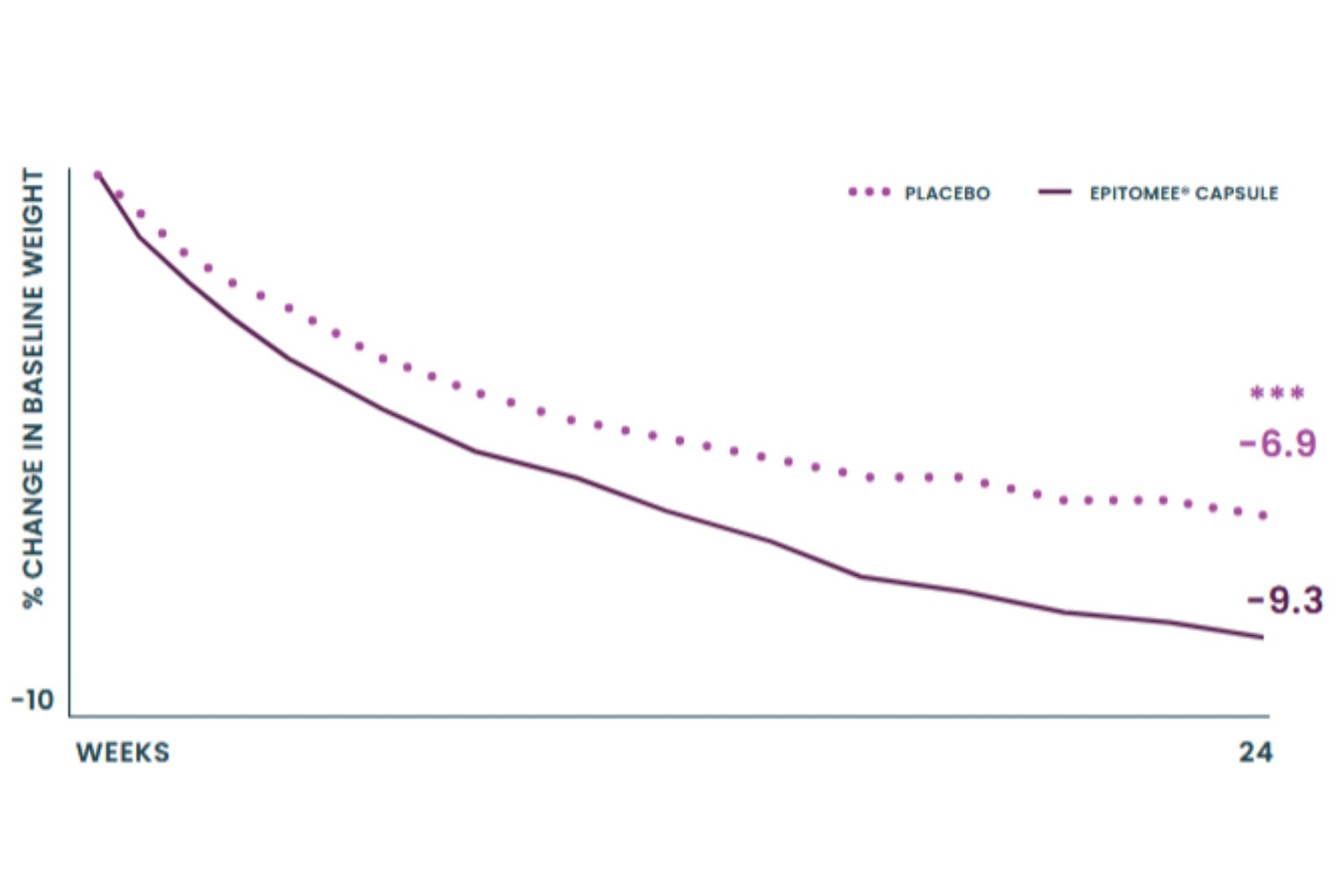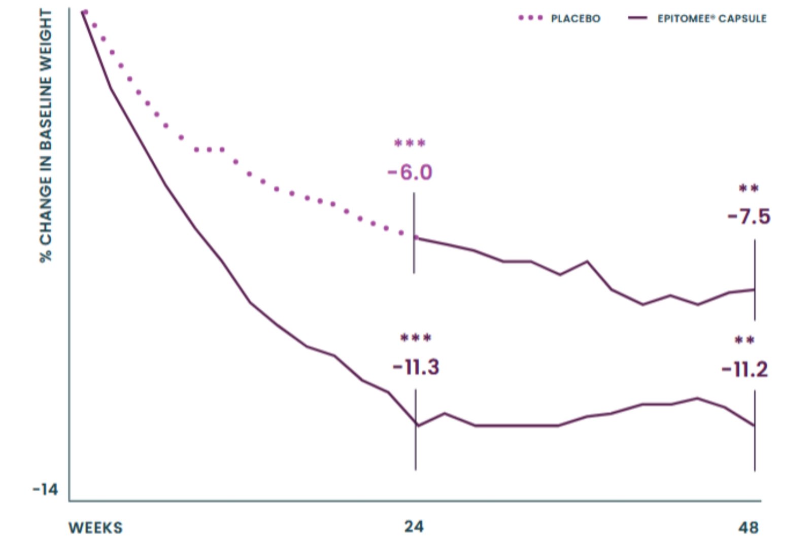 Those on placebo lost 6.0% after 24 weeks. After switching to the Epitomee® capsule, they lost an additional 1.5% over the next 24 weeks.